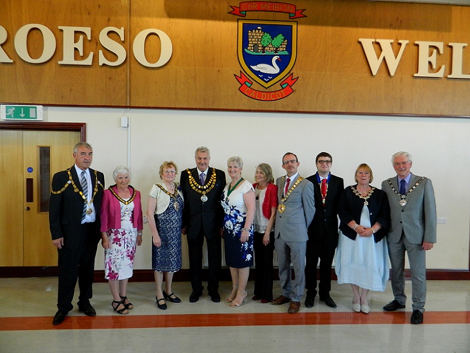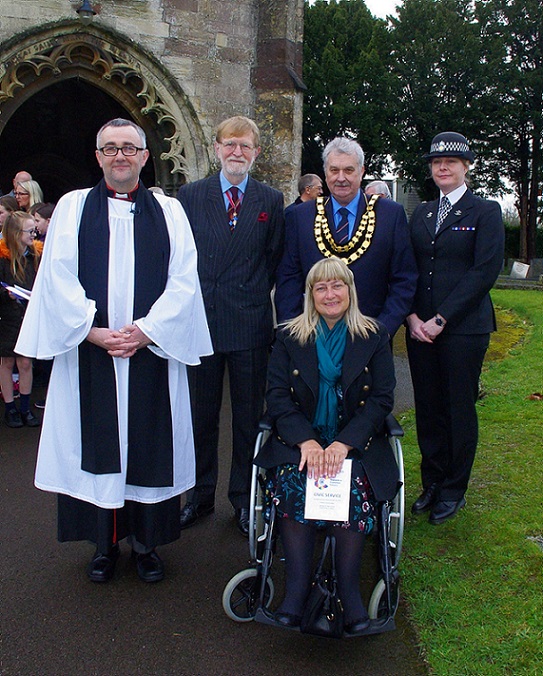 Rev Cannon Jeremy Harris, Richard "Sandy" Blair CBE Deputy Lord Lieutenant of Gwent, Cllr Philip Stevens Mayor Caldicot Town Council, PC Alison Finister Schools Liaison Officer, and Cllr Donna James Chair Magor with Undy Community Council.