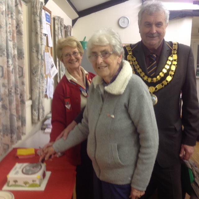 Mrs R Waring cutting the cake assisted by the Mayor