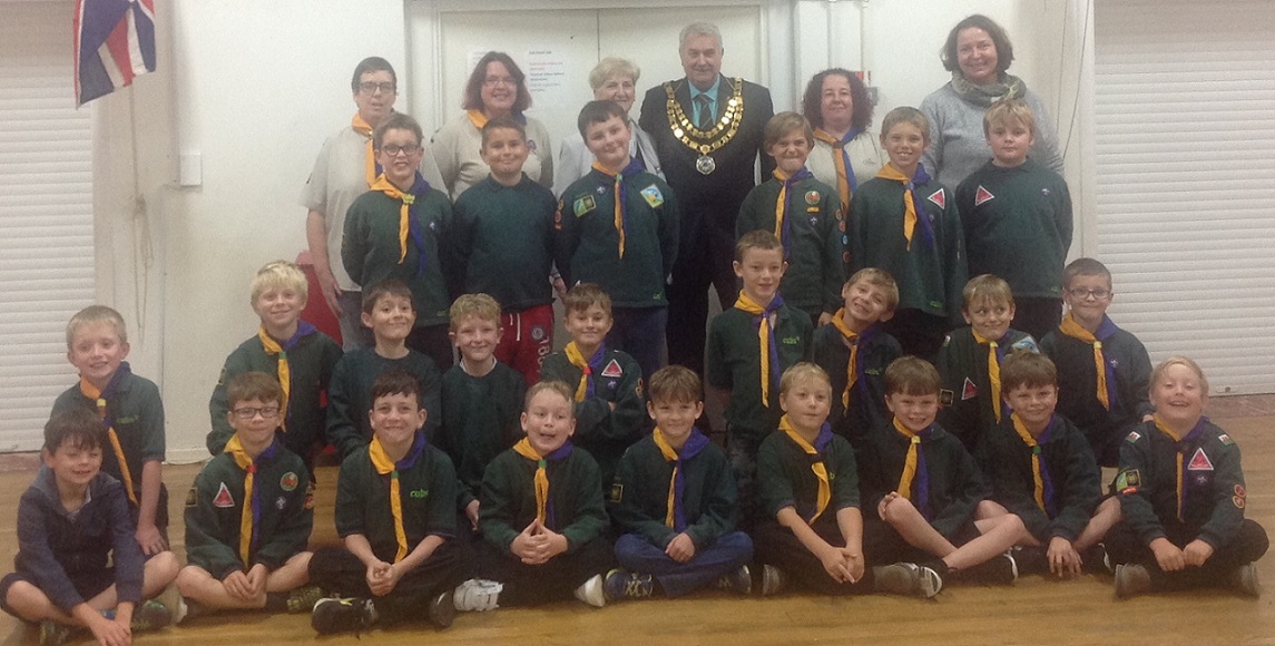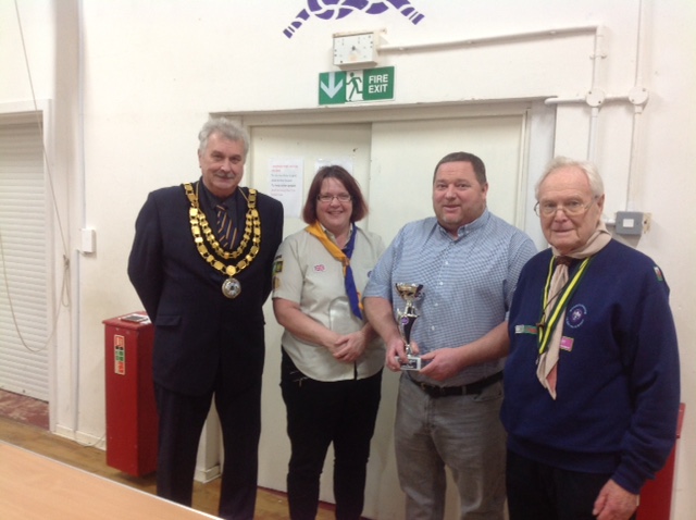 L to R: Mayor, Cllr P Stevens, Scout leader Rachel Smith, Mayors Cup winner Mark Lane and the District Treasurer.