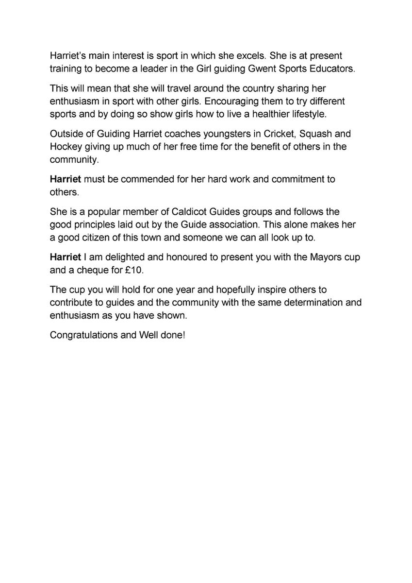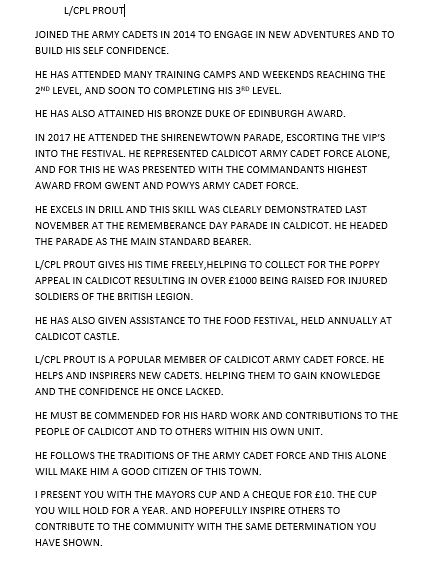 The Mayor, Cllr P Stevens presented the Mayors cup to Sgt.Cadet Rosie Huff of 2012 Sqd. Caldicot ATC at Caldicot Choir Hall. More than 60 people were in attendance.