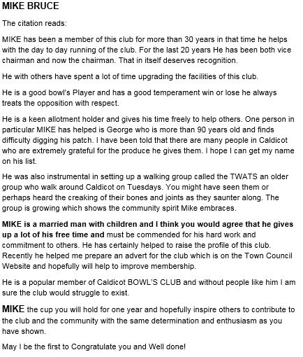 Mayors cup to Mike Bruce, Caldicot Bowls Club.