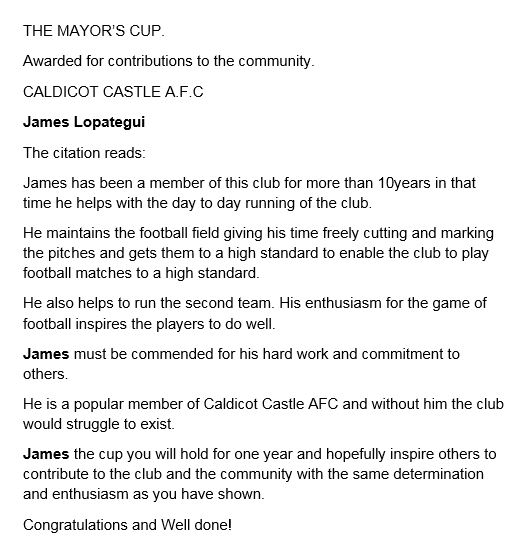 The Mayor, Cllr P Stevens presented the Mayors Cup to James Lopategui, member of Caldicot Castle AFC.